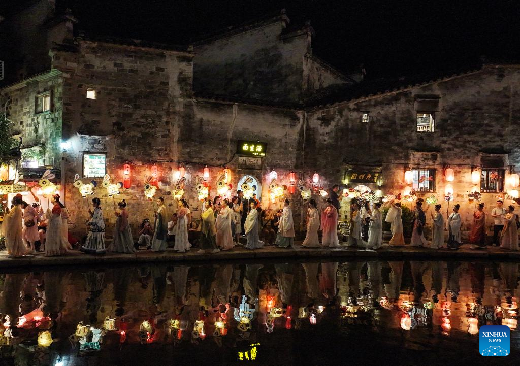 In this drone photo, people dressed in traditional Chinese costumes attend a lantern parade in Hongcun Village of Yixian County, east China's Anhui Province, Sept. 15, 2024. (Photo by Shi Yalei/Xinhua)