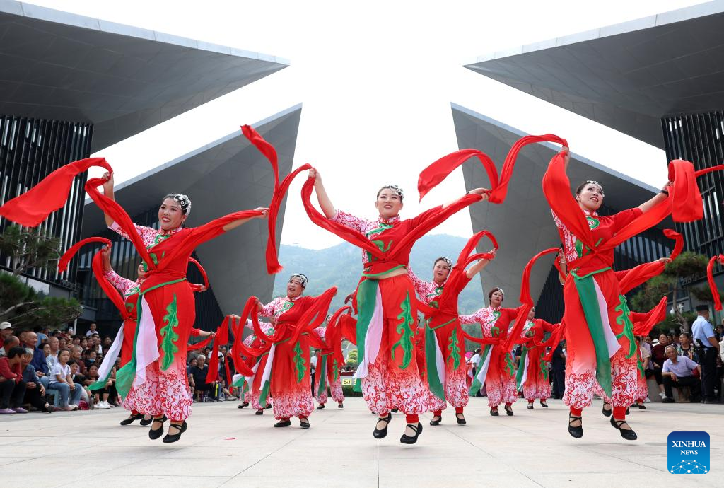 Actors perform Yangge, a traditional folk dance, for tourists at Pingshan County, Shijiazhuang City, north China's Hebei Province, Sept. 17, 2024. (Photo by Liang Zidong/Xinhua)
