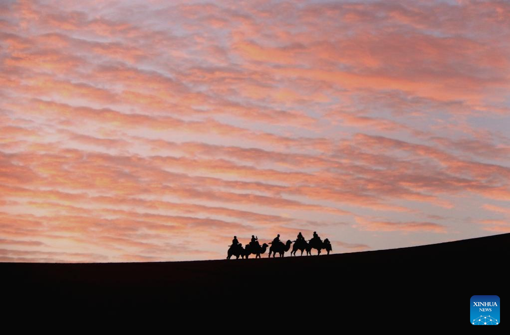 Tourists ride camels at the Mingshashan and Crescent Lake, an oasis scenic spot in the Gobi Desert, in Dunhuang, northwest China's Gansu Province, Sept. 15, 2024. (Photo by Zhang Xiaoliang/Xinhua)
