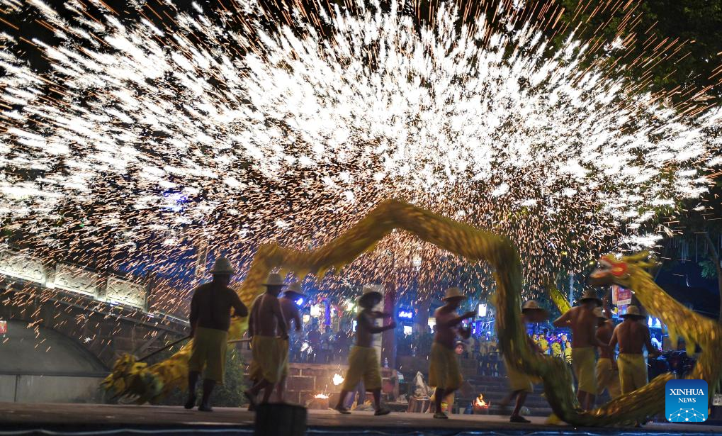 Folk artists perform a dragon fireworks dance at the Huanglong creek ancient town in Chengdu, capital of southwest China's Sichuan Province, Spet. 16, 2024. (Photo by Li Xiangyu/Xinhua)