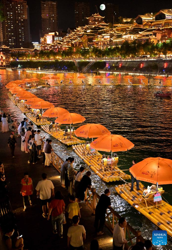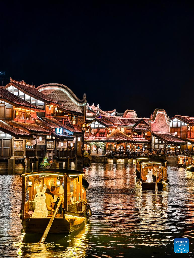 Tourists take boats to enjoy the night view of the Lizhuang ancient town in Yibin, southwest China's Sichuan Province, Sept. 16, 2024. (Photo by Ye Changrong/Xinhua)