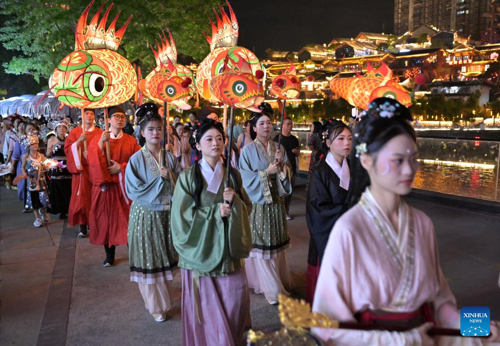 People dressed in traditional Chinese costumes attend a parade in Xuan'en County, central China's Hubei Province, Sept. 16, 2024. (Photo by Song Wen/Xinhua)