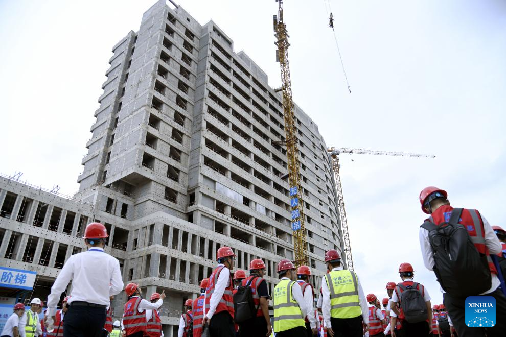 People watch a demonstration of an unmanned remote tower crane working at a construction site in Huangdao District of Qingdao, east China's Shandong Province, Sept. 18, 2024. China Construction Eighth Engineering Division launched its self-developed new generation of unmanned remote tower crane in Qingdao on Wednesday. (Xinhua/Li Ziheng)