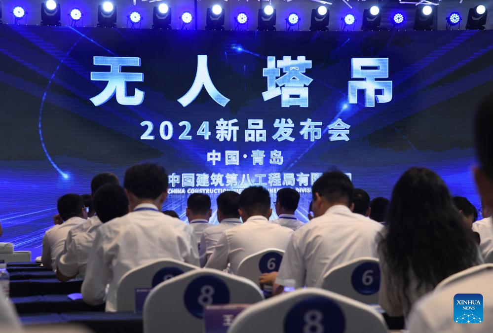 A launching ceremony of an unmanned remote tower crane is held in Qingdao, east China's Shandong Province, Sept. 18, 2024. China Construction Eighth Engineering Division launched its self-developed new generation of unmanned remote tower crane in Qingdao on Wednesday. (Xinhua/Li Ziheng)