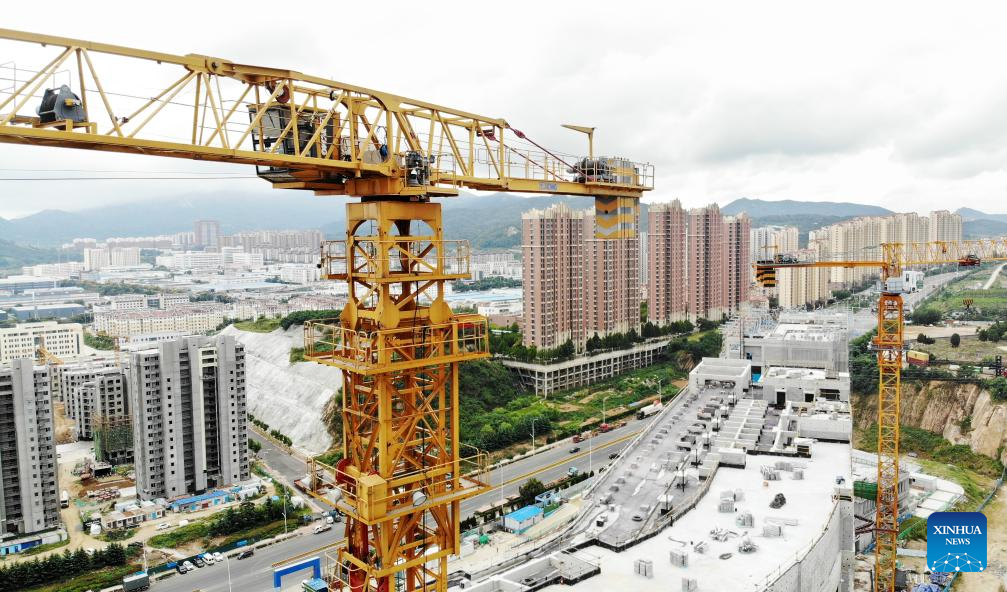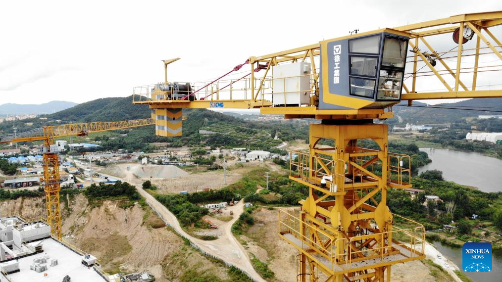 An aerial drone photo shows an unmanned remote tower crane during a demonstration at a construction site in Huangdao District of Qingdao, east China's Shandong Province, Sept. 18, 2024. China Construction Eighth Engineering Division launched its self-developed new generation of unmanned remote tower crane in Qingdao on Wednesday. (Xinhua/Li Ziheng)