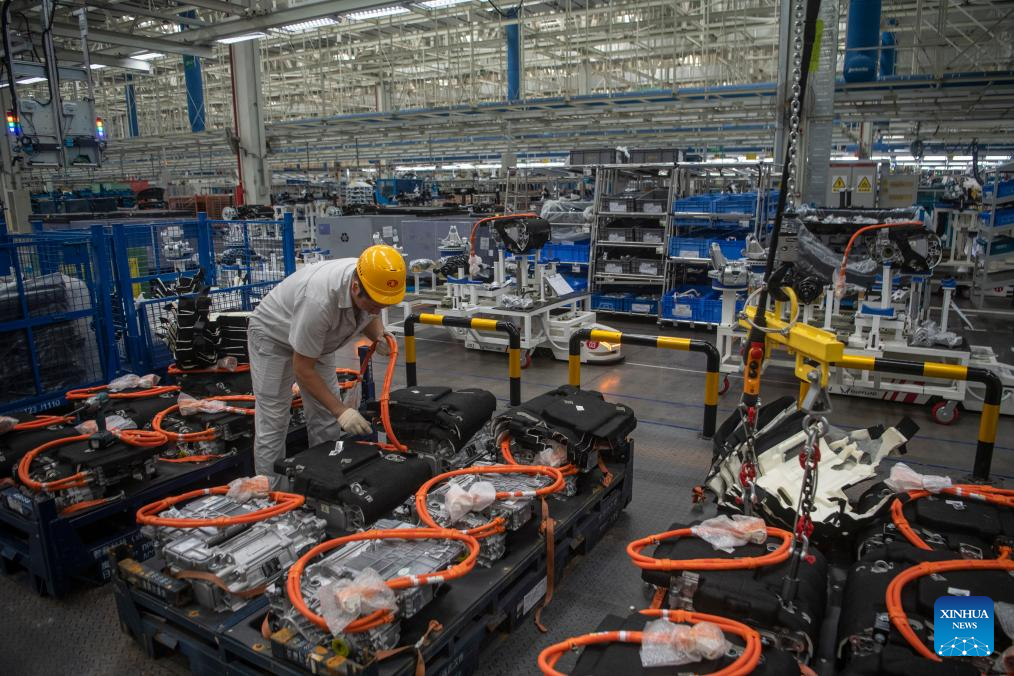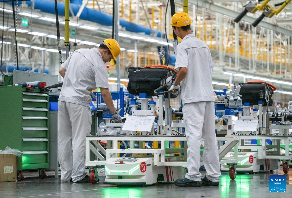Workers transport motors for electric vehicles at an assembly line of Dongfeng Motor Corporation in Wuhan, central China's Hubei Province, Sept. 6, 2024. (Xinhua/Hu Jingwen)