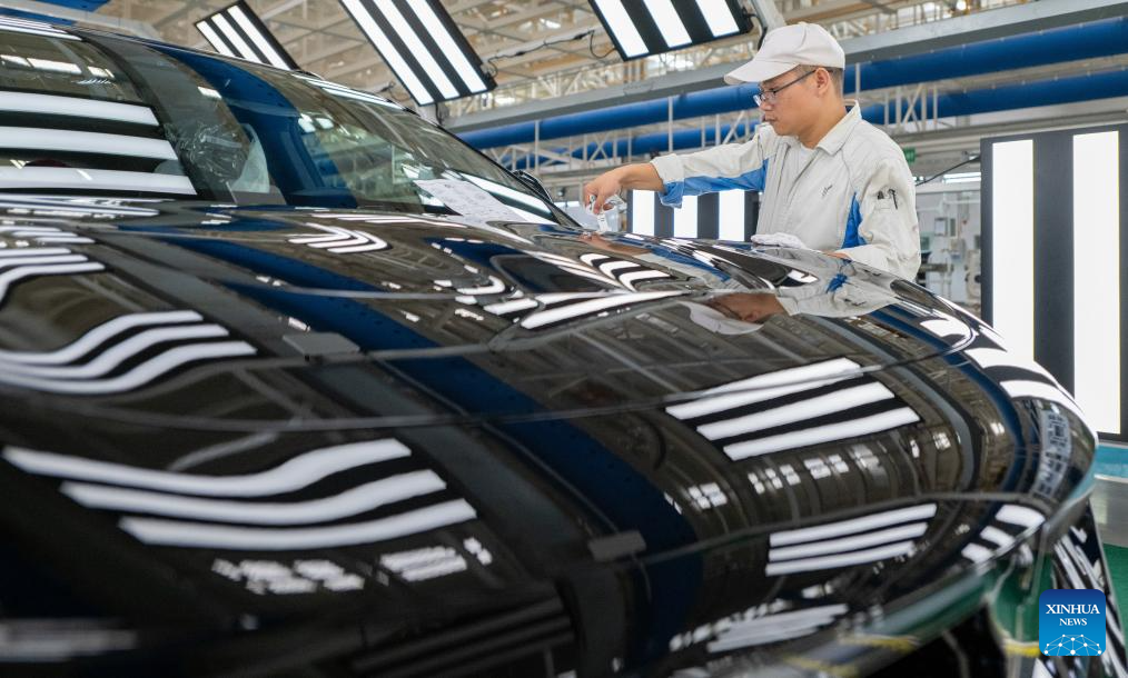 A worker checks the paint of a new vehicle at an assembly line of Dongfeng Motor Corporation in Wuhan, central China's Hubei Province, Sept. 6, 2024. (Xinhua/Wu Zhizun)