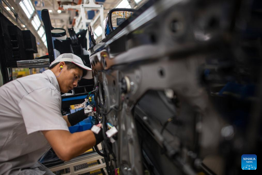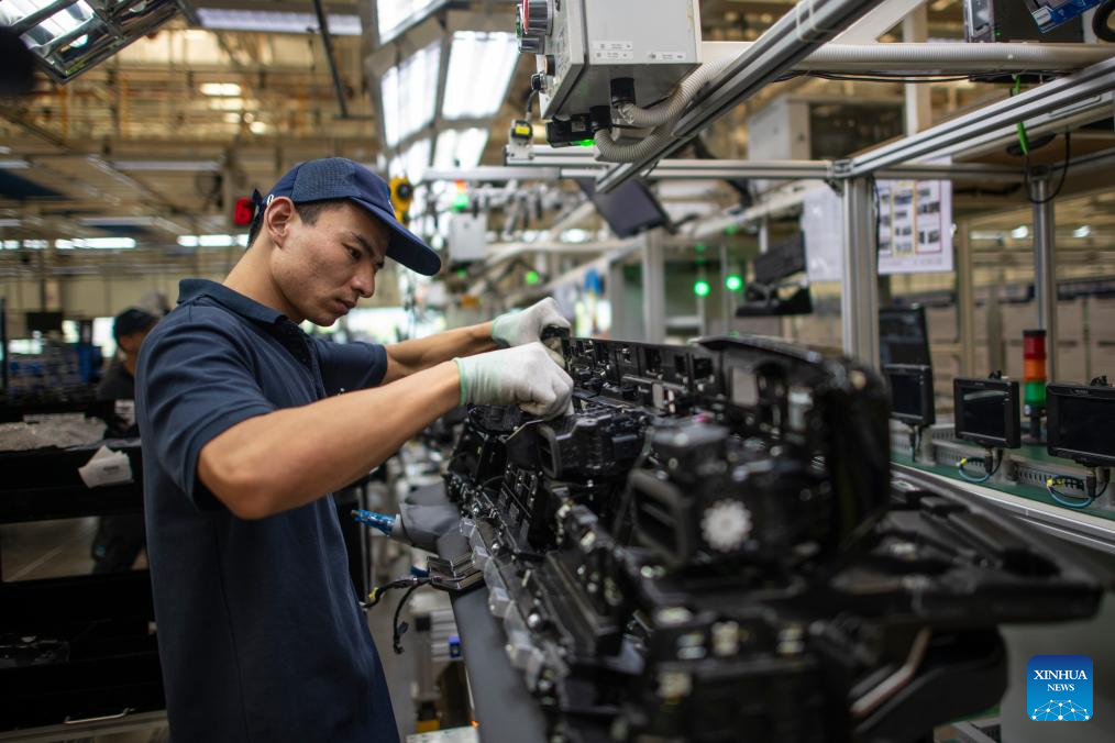 A worker installs the dashboard to a vehicle at an assembly line of Dongfeng Motor Corporation in Wuhan, central China's Hubei Province, Sept. 6, 2024. (Xinhua/Wu Zhizun)