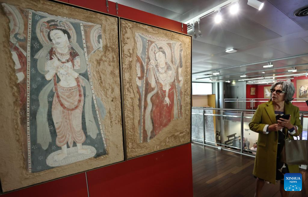 A woman visits the Silk Road Danqing, an exhibition of copies of cave temple mural paintings along the ancient Silk Road at the China Cultural Center in Paris, France, Sept. 18, 2024. The exhibition will last till Sept. 24, 2024. (Xinhua/Gao Jing)