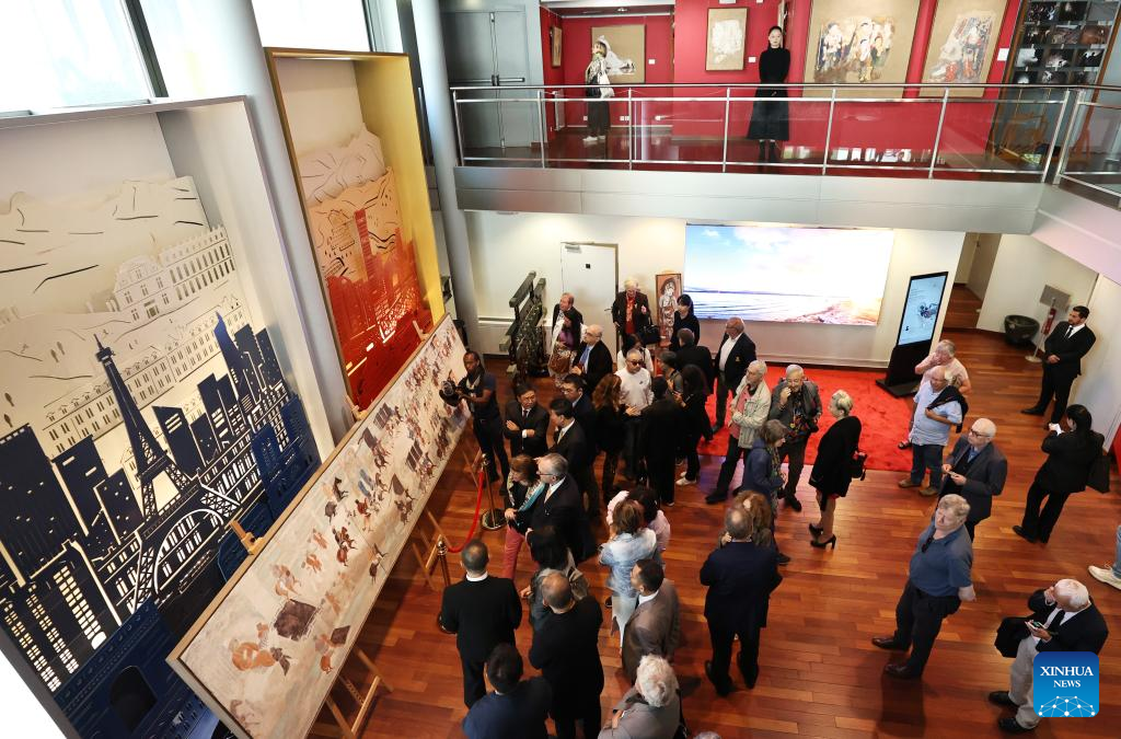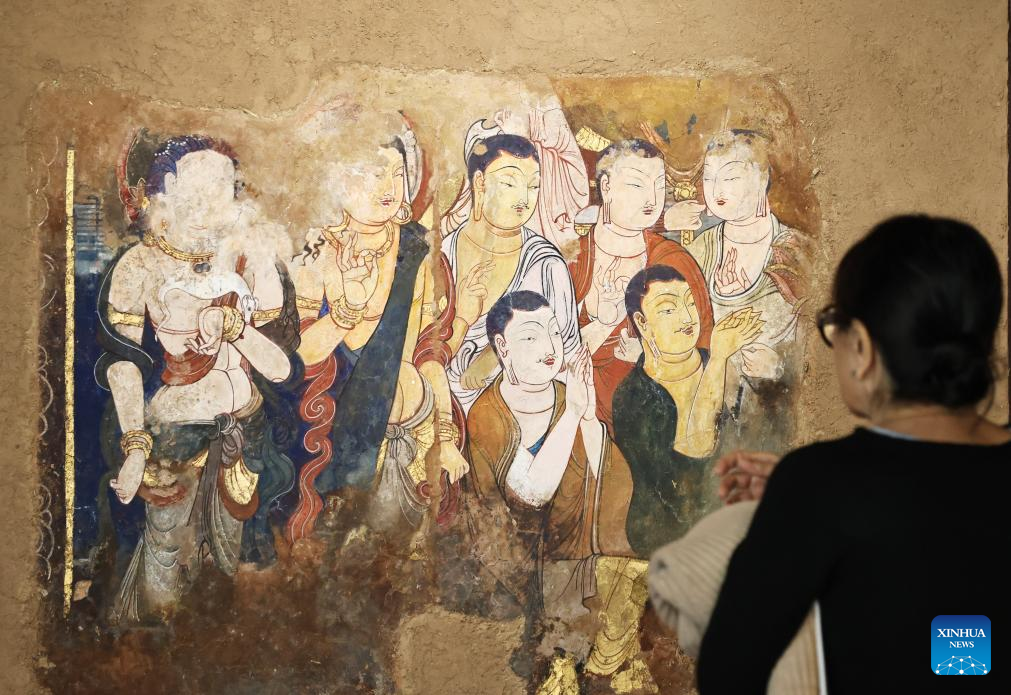 Guests visit the Silk Road Danqing, an exhibition of copies of cave temple mural paintings along the ancient Silk Road at the China Cultural Center in Paris, France, Sept. 18, 2024. The exhibition will last till Sept. 24, 2024. (Xinhua/Gao Jing)