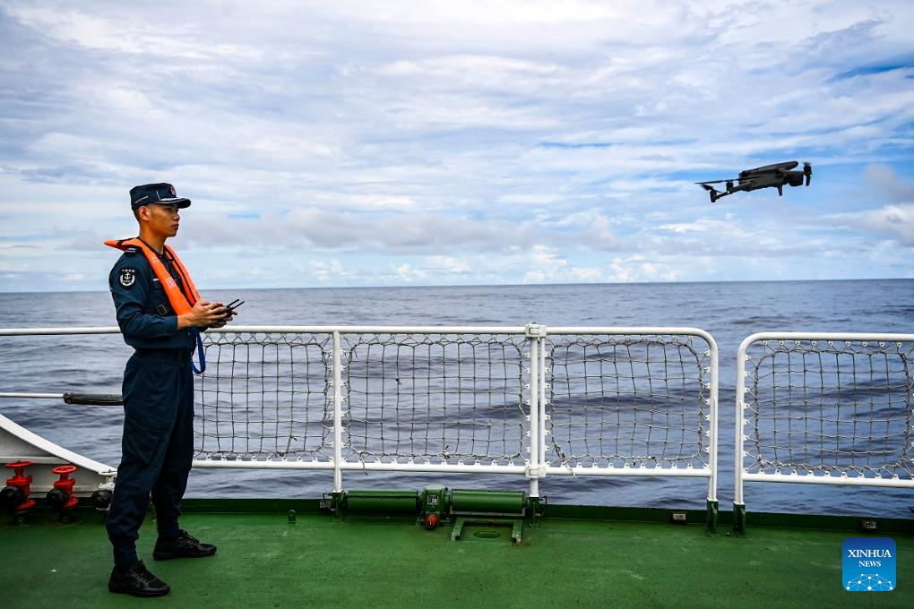 A law enforcer attends a drone control training session on China Coast Guard (CCG) vessel Sifang during a patrol task in waters adjacent to China's Huangyan Dao, Sept. 14, 2024. (Xinhua/Cao Yiming)