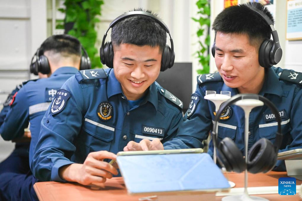 Law enforcers enjoy their leisure time on China Coast Guard (CCG) vessel Sifang during a patrol task in waters adjacent to China's Huangyan Dao, Sept. 10, 2024. (Xinhua/Cao Yiming)