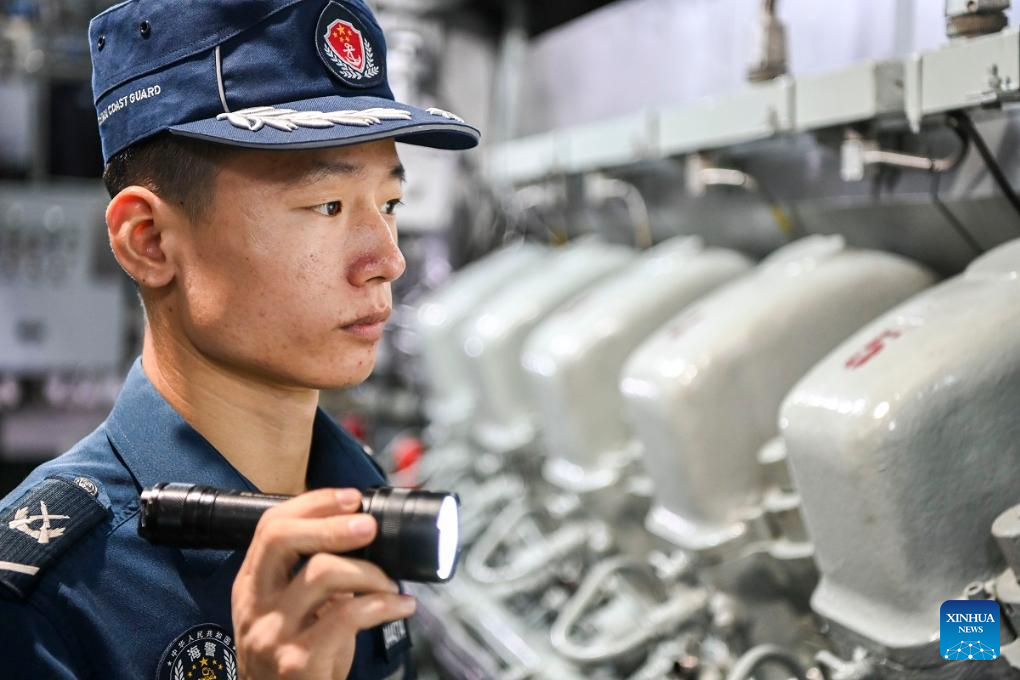 A law enforcer inspects equipment on China Coast Guard (CCG) vessel Sifang during a patrol task in waters adjacent to China's Huangyan Dao, Sept. 14, 2024. (Xinhua/Cao Yiming)