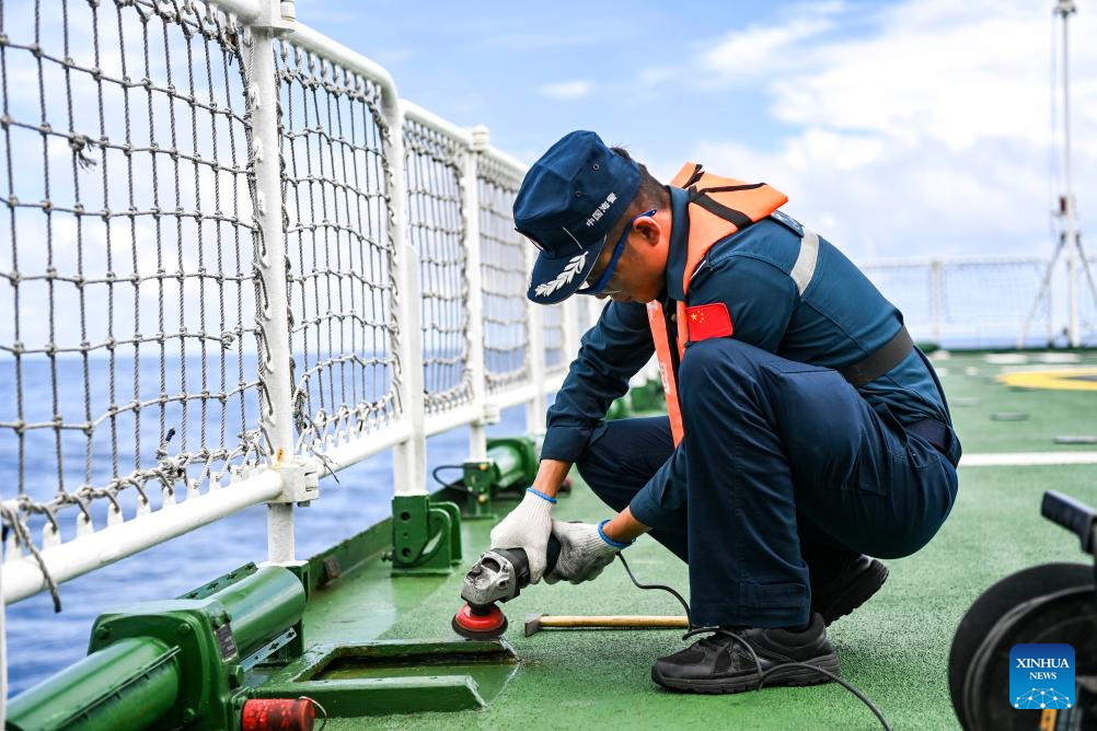 A law enforcer maintains equipment on China Coast Guard (CCG) vessel Sifang during a patrol task in waters adjacent to China's Huangyan Dao, Sept. 14, 2024. (Xinhua/Cao Yiming)