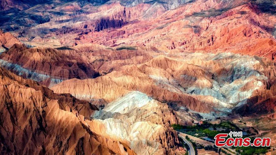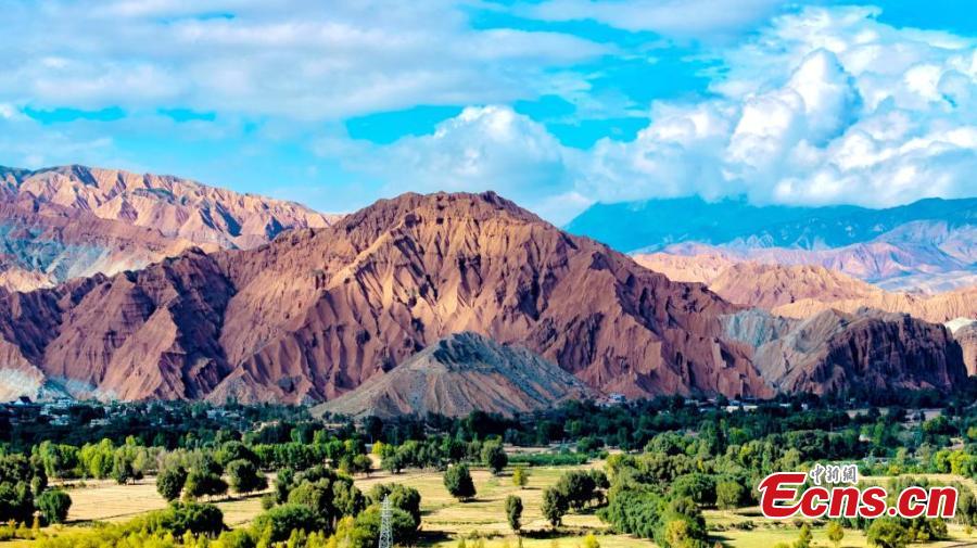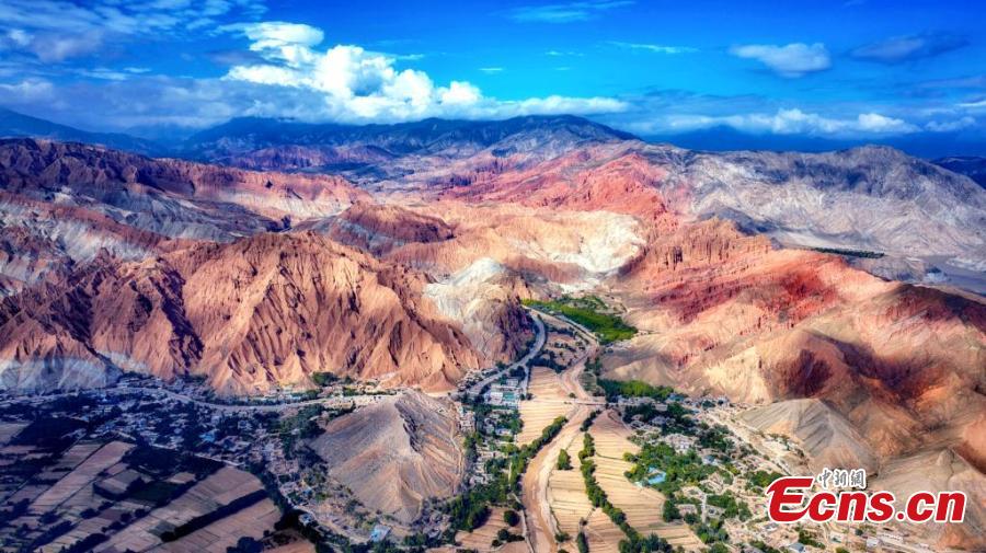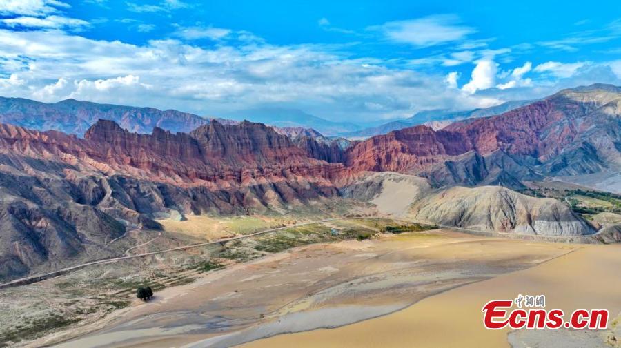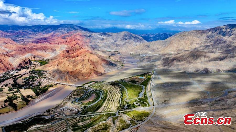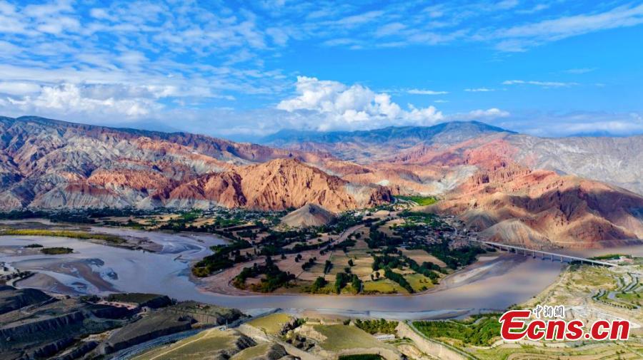 Magnificent scenery of Danxia landform with the Yellow River passing through a canyon in Guide County, the Tibetan Autonomous Prefecture of Hainan, northwest China's Qinghai Province. (Photo: China News Service/Song Zhongyong)