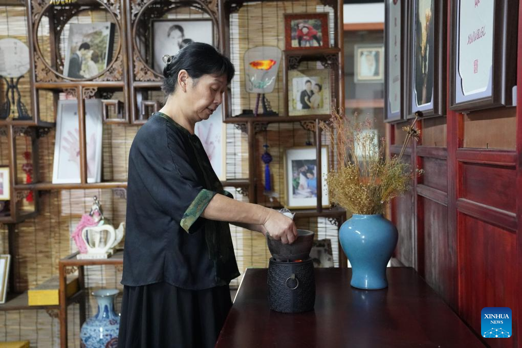 Tao Yonghong dyes hair at her studio in Nanchang, east China's Jiangxi Province, Sept. 14, 2024. (Xinhua/Zhou Mi)