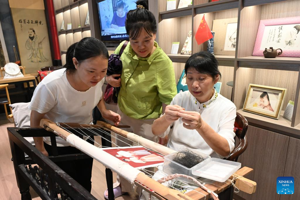 Tao Yonghong (R) demonstrates Gan hair embroidery making to visitors at an exhibition center for intangible cultural heritage in Nanchang, east China's Jiangxi Province, Sept. 13, 2024. (Xinhua/Sui Shangjun)