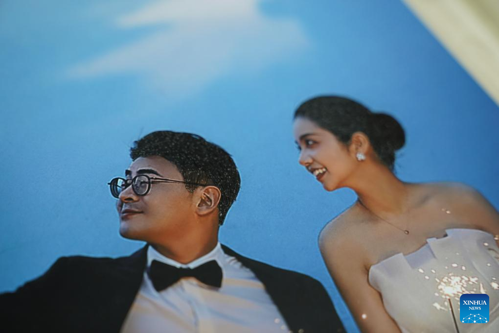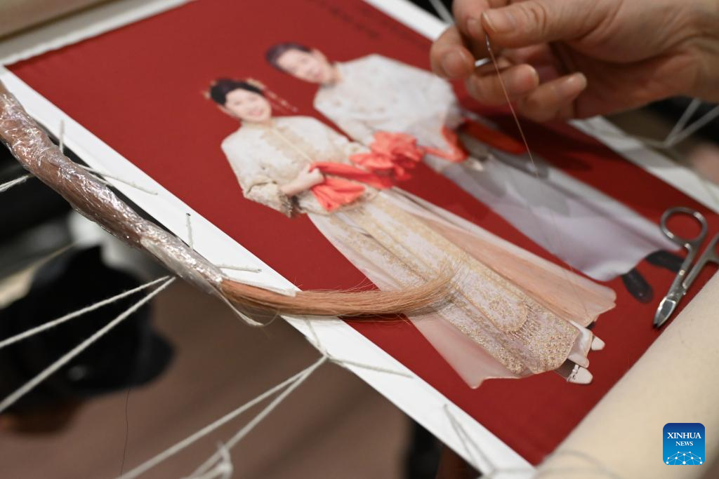 A Gan hair embroidery work of Tao Yonghong, themed on a newly married couple whose hair were depicted with their own hair, is seen at her studio in Nanchang, east China's Jiangxi Province, Sept. 13, 2024. (Xinhua/Zhou Mi)