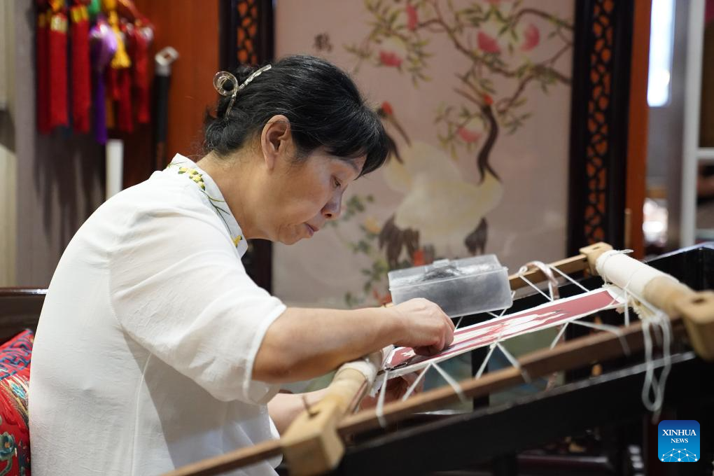 Tao Yonghong makes a Gan hair embroidery work at an exhibition center for intangible cultural heritage in Nanchang, east China's Jiangxi Province, Sept. 13, 2024. (Xinhua/Zhou Mi)