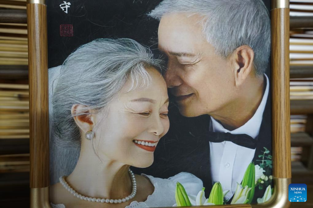 A Gan hair embroidery work of Tao Yonghong, themed on an elderly couple that have been married for 50 years, is seen at her studio in Nanchang, east China's Jiangxi Province, Sept. 13, 2024. (Xinhua/Zhou Mi)