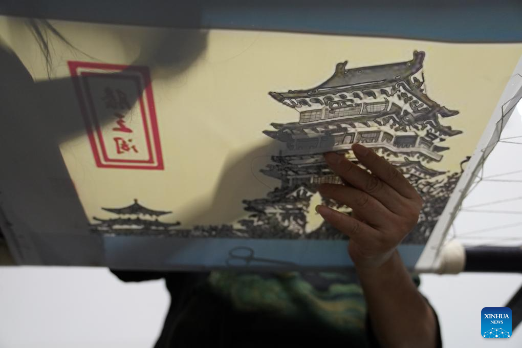Tao Yonghong makes a Gan hair embroidery work themed on Tengwang Pavilion, a historic landmark, at her studio in Nanchang, east China's Jiangxi Province, Sept. 14, 2024. (Xinhua/Zhou Mi)