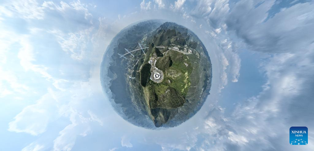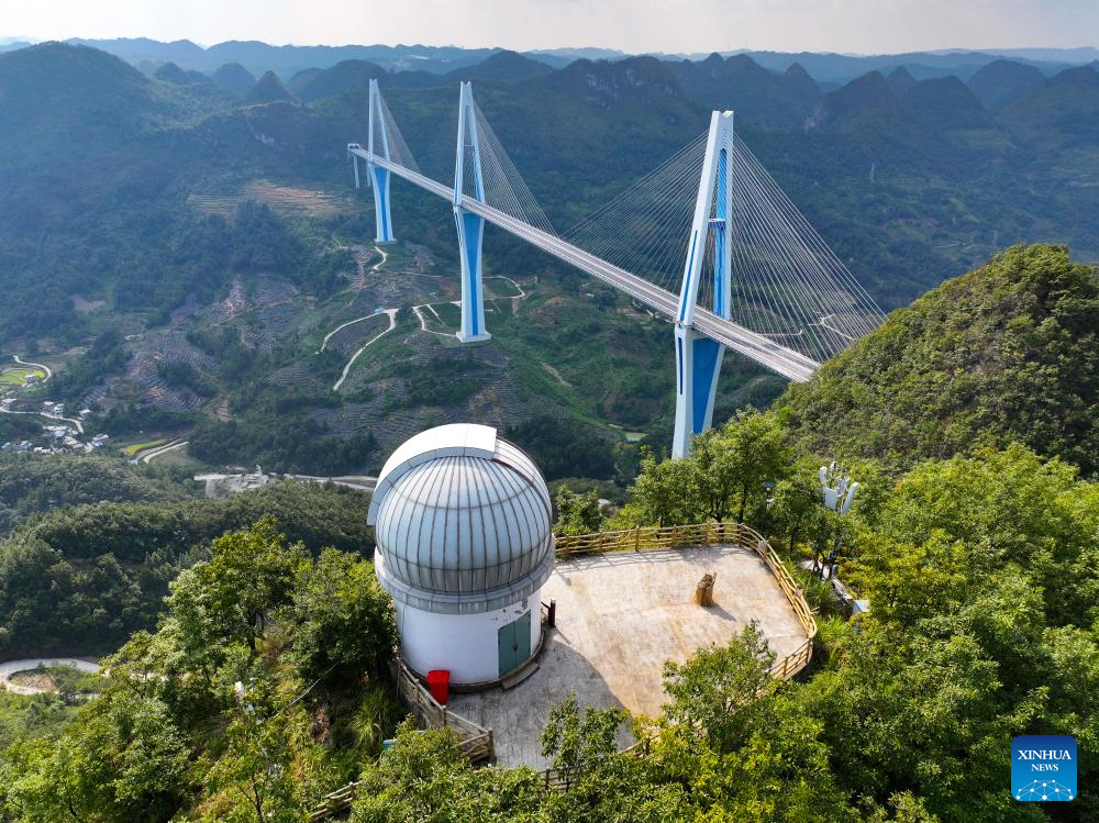 A drone photo shows an astronomic telescope at the "Sky Bridge" sightseeing service area in Pingtang County, southwest China's Guizhou Province, Sept. 5, 2024. (Xinhua/Liu Xu)