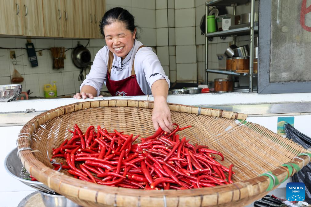 A villager select peppers at a homestay near the Daxiaojing grand bridge in southwest China's Guizhou Province, Sept. 5, 2024. (Xinhua/Ou Dongqu)