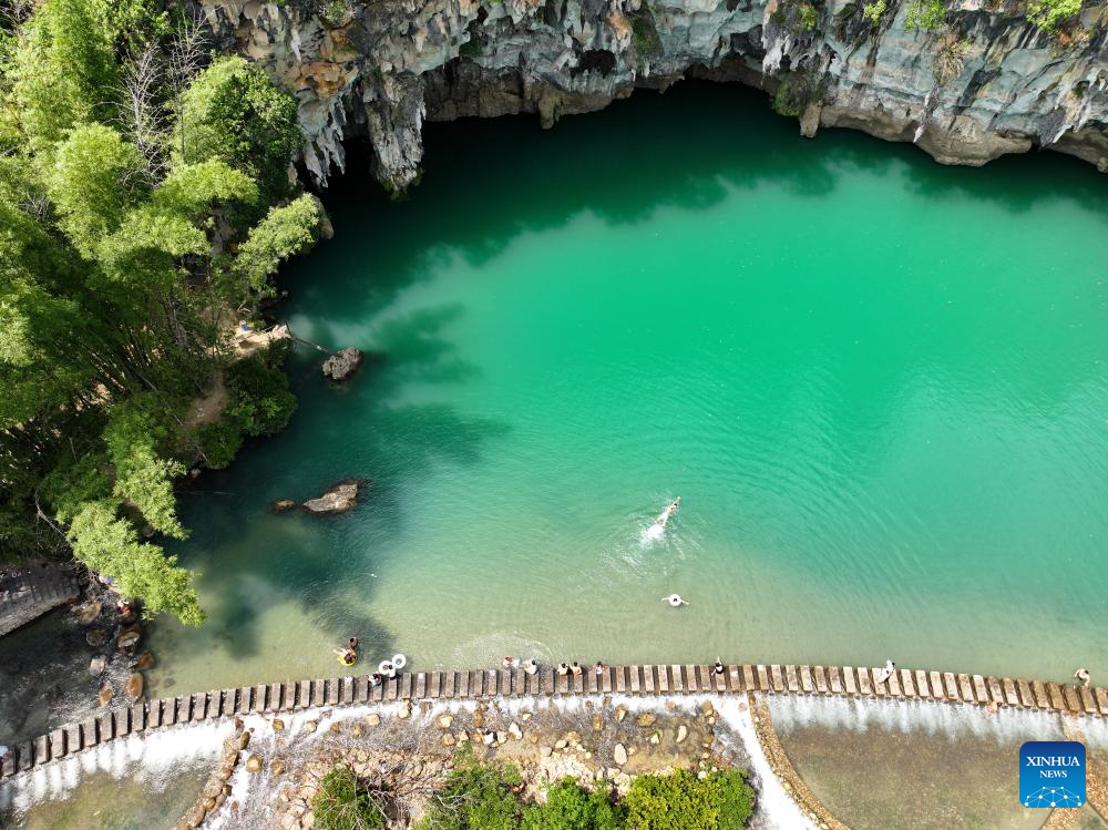 An aerial drone photo shows people visiting Daxiaojing scenic spot in Luodian County, southwest China's Guizhou Province, Sept. 5, 2024. (Xinhua/Liu Xu)