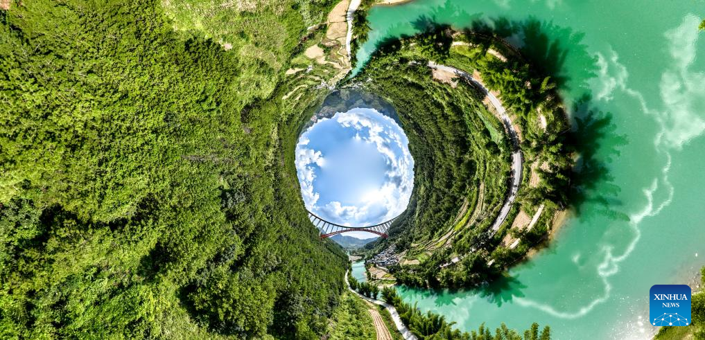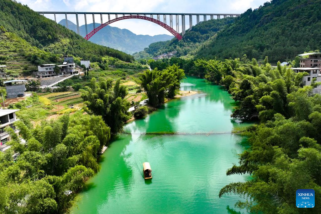 A drone photo shows a bamboo raft carrying tourists at a scenic spot near the Daxiaojing grand bridge in southwest China's Guizhou Province, Sept. 5, 2024. (Xinhua/Liu Xu)