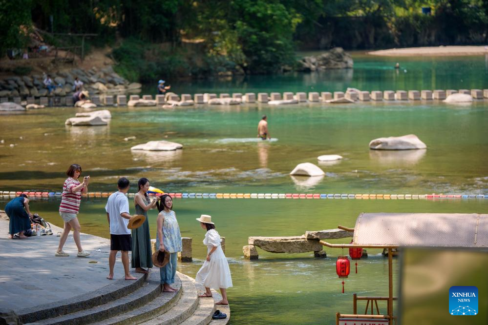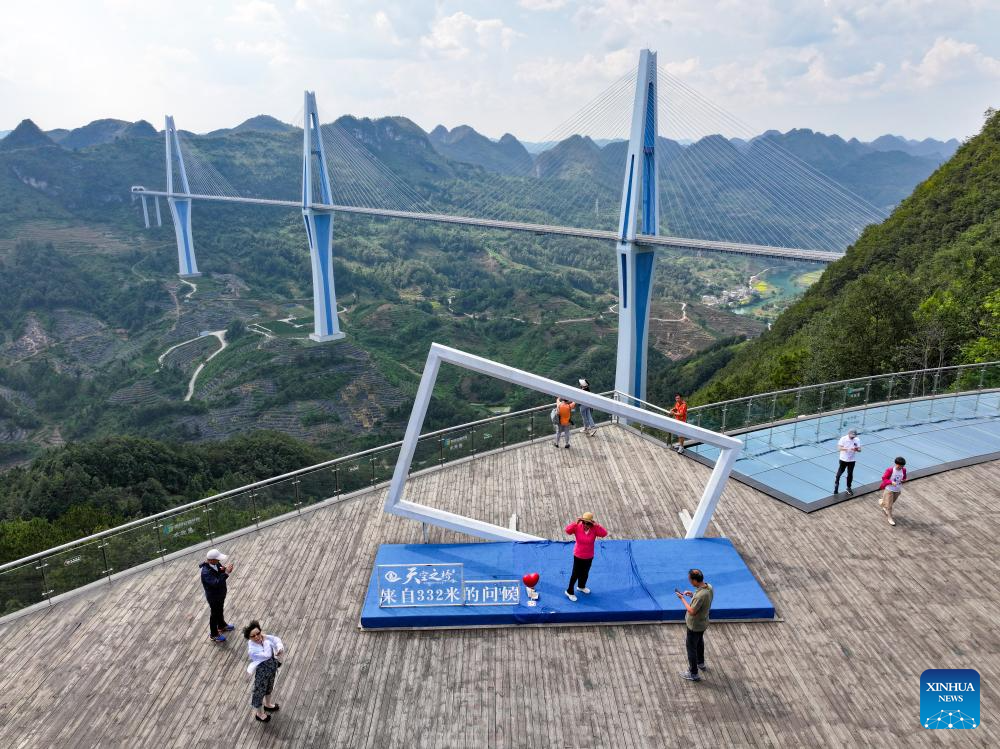 Visitors have fun at a scenic spot near the Daxiaojing grand bridge in southwest China's Guizhou Province, Sept. 5, 2024. (Xinhua/Liu Xu)
