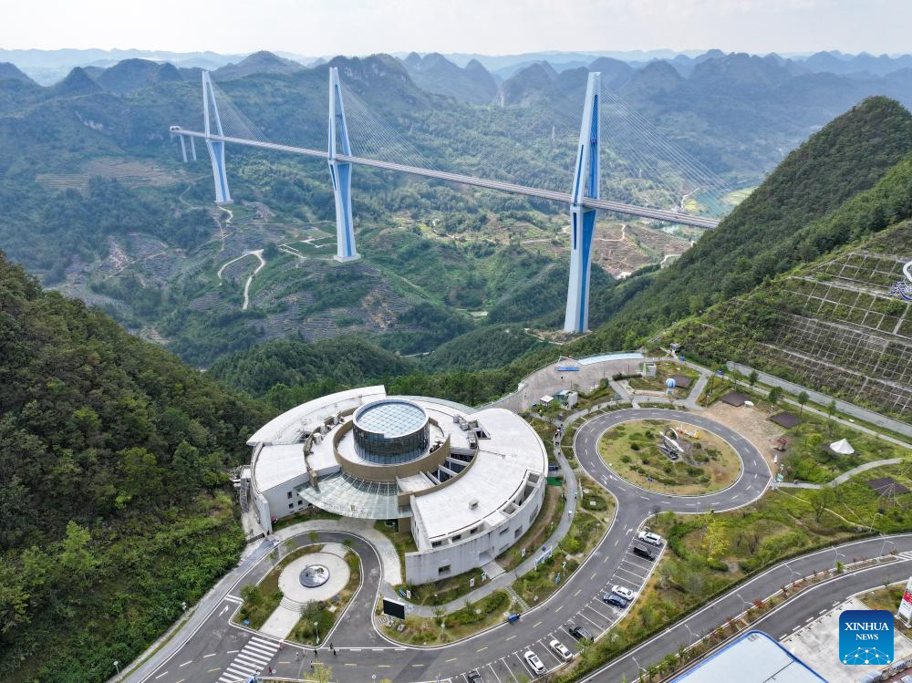 An aerial drone photo shows the "Sky Bridge" sightseeing service area in Pingtang County, southwest China's Guizhou Province, Sept. 5, 2024. (Xinhua/Liu Xu)