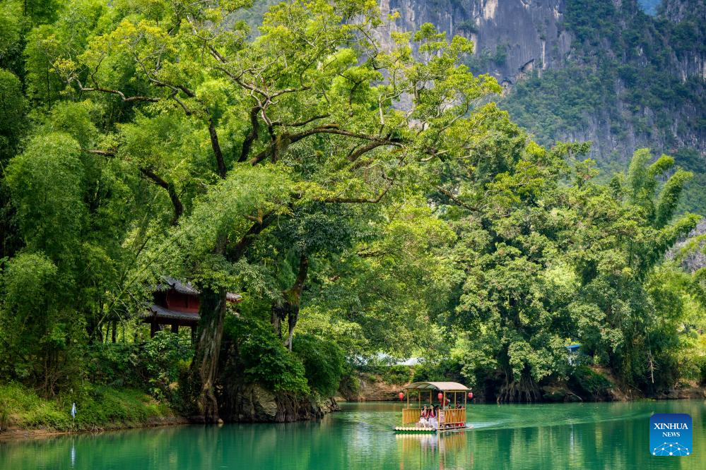 An aerial drone photo shows a bamboo raft carrying tourists at a scenic spot near the Daxiaojing grand bridge in southwest China's Guizhou Province, Sept. 5, 2024. (Xinhua/Liu Xu)