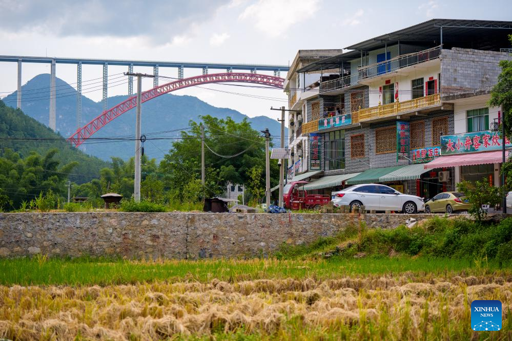 This photo shows restaurants and homestay at a scenic spot near the Daxiaojing grand bridge in southwest China's Guizhou Province, Sept. 5, 2024. (Xinhua/Liu Xu)