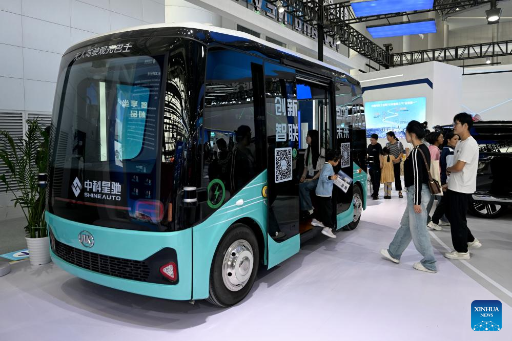 Visitors experience an unmanned sightseeing bus at the 2024 World Manufacturing Convention in Hefei, east China's Anhui Province, Sept. 21, 2024. (Xinhua/Huang Bohan)