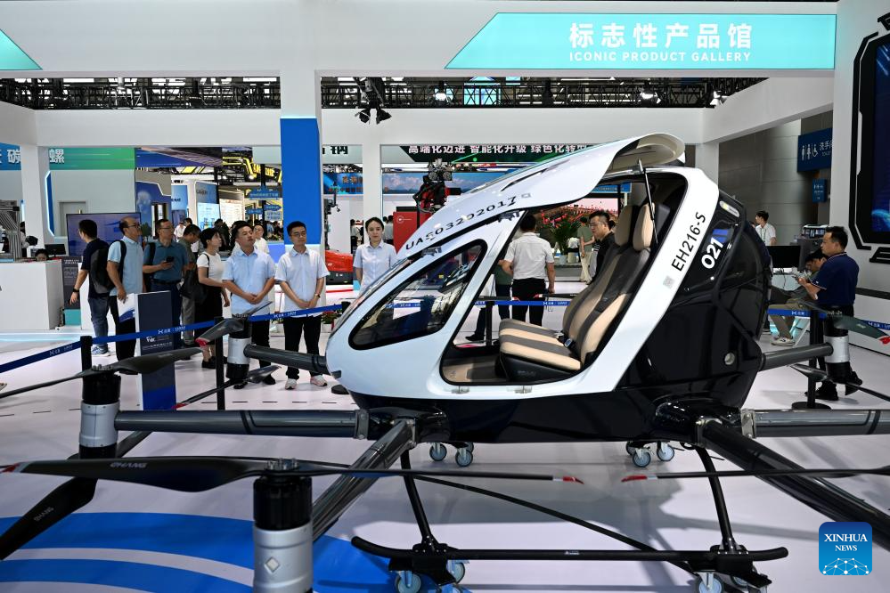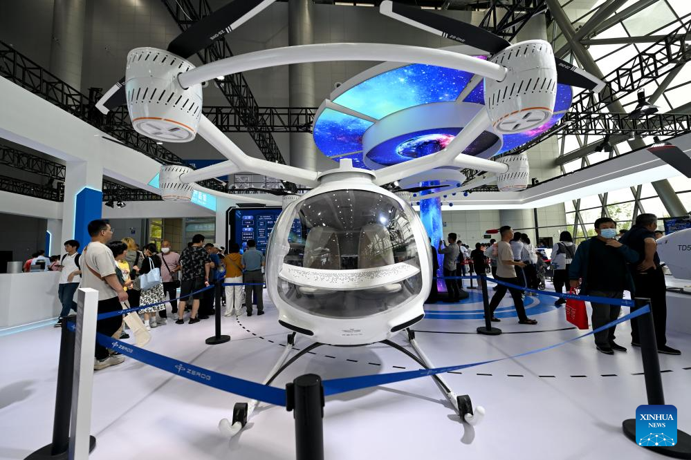 Visitors learn about an electric vertical takeoff and landing aircraft at the 2024 World Manufacturing Convention in Hefei, east China's Anhui Province, Sept. 20, 2024. (Xinhua/Huang Bohan)