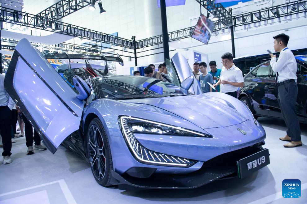 Visitors learn about a BYD Yangwang U9 at the 2024 World Manufacturing Convention in Hefei, east China's Anhui Province, Sept. 20, 2024. (Xinhua/Fu Tian)
