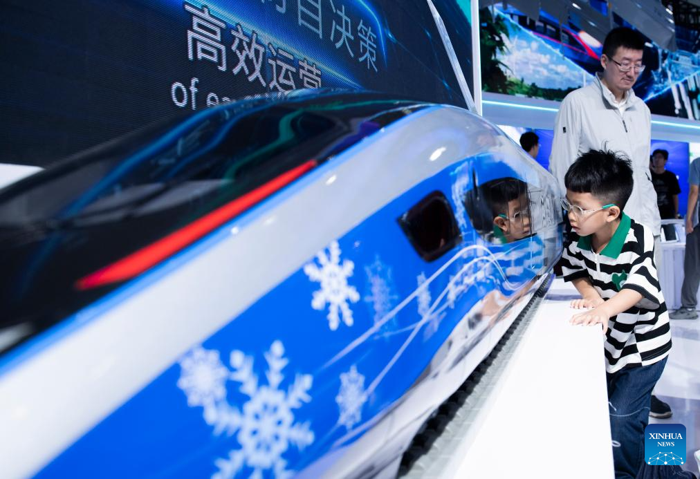 A boy looks at a model of an intelligent electric multiple unit (EMU) at the 2024 World Manufacturing Convention in Hefei, east China's Anhui Province, Sept. 21, 2024. (Xinhua/Fu Tian)