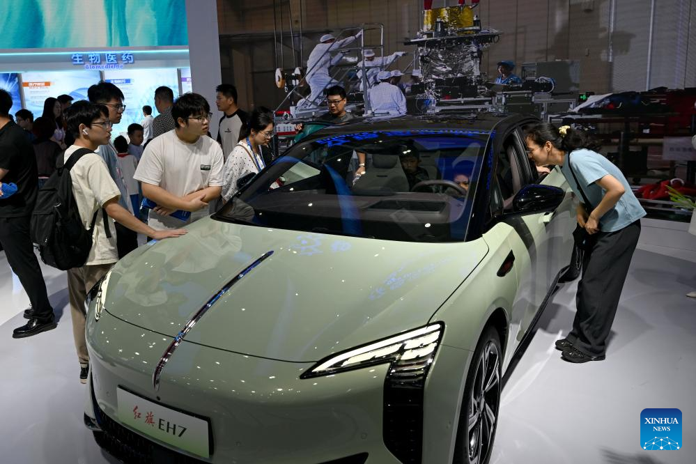 Visitors look at a Hongqi EH7 new energy car at the 2024 World Manufacturing Convention in Hefei, east China's Anhui Province, Sept. 21, 2024. (Xinhua/Huang Bohan)