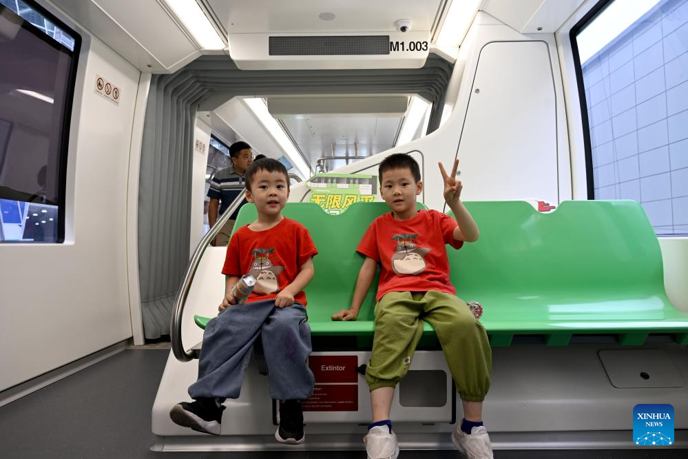 Children pose for photos on a straddle-type monorail train at the 2024 World Manufacturing Convention in Hefei, east China's Anhui Province, Sept. 21, 2024. (Xinhua/Huang Bohan)