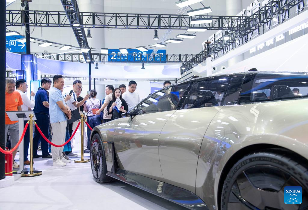 Visitors learn about a concept car displayed at the 2024 World Manufacturing Convention in Hefei, east China's Anhui Province, Sept. 21, 2024. (Xinhua/Fu Tian)