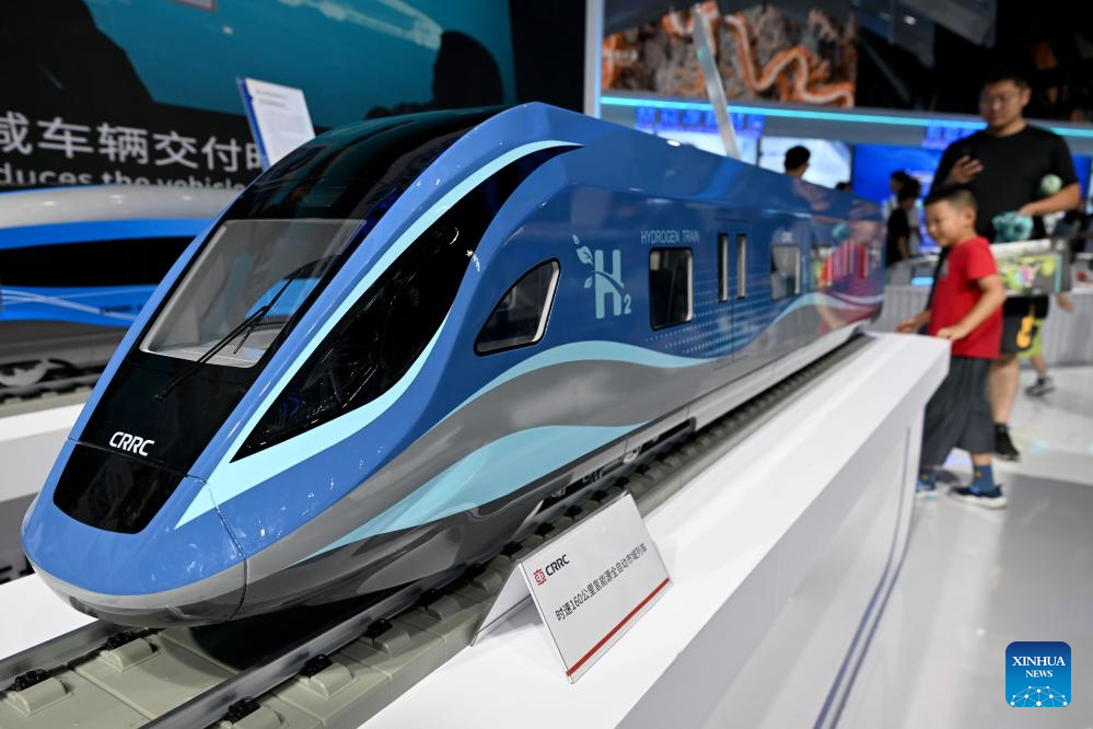 Visitors look at a model of a fully automatic hydrogen-powered train at the 2024 World Manufacturing Convention in Hefei, east China's Anhui Province, Sept. 21, 2024. (Xinhua/Huang Bohan)