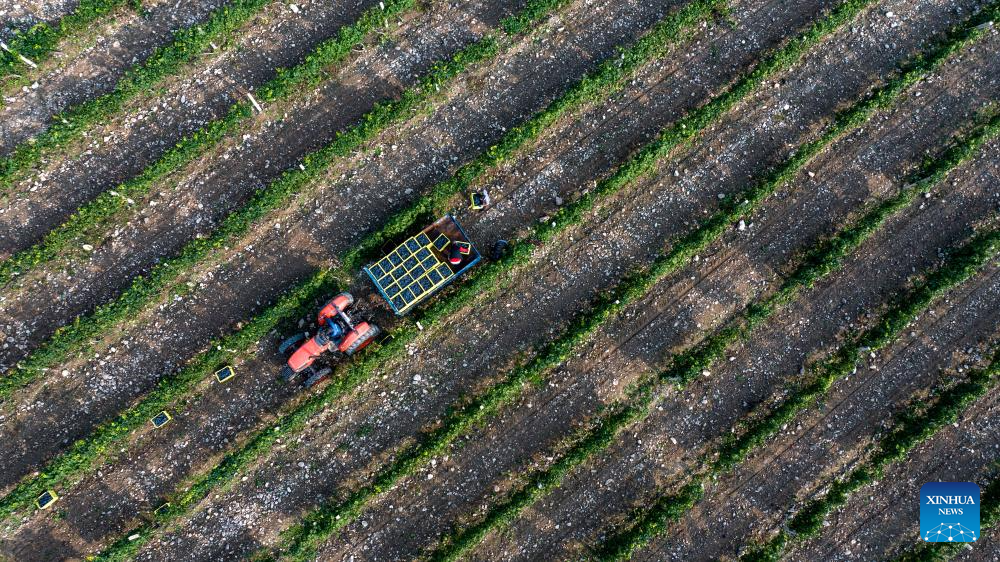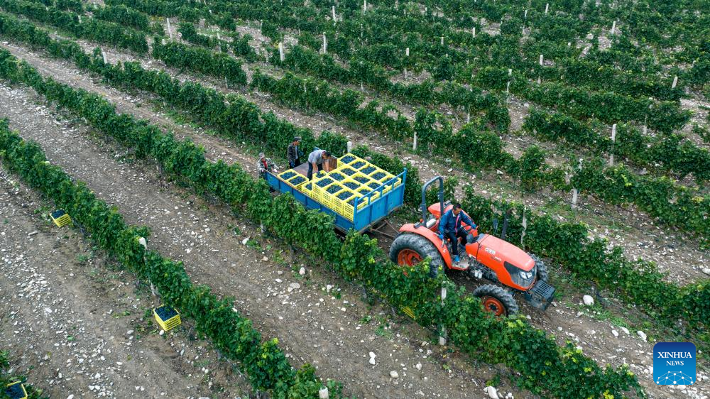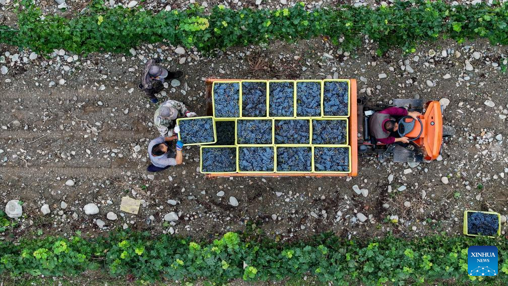 An aerial drone photo taken on Sept. 19, 2024 shows farmers transporting harvested grapes in a vineyard at the eastern foot of Helan Mountain in northwest China's Ningxia Hui Autonomous Region. With a dry climate and abundant sunshine, the eastern foot of Helan Mountain is widely regarded as a "golden zone" for wine grape cultivation and high-end wine production. The region has entered this year's harvest season of the wine grape recently. (Xinhua/Yang Zhisen)