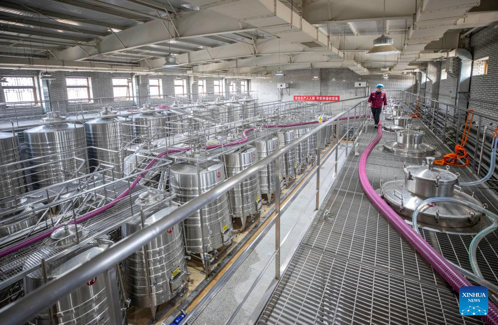 A worker checks the fermenting grapes in a winery at the eastern foot of Helan Mountain in northwest China's Ningxia Hui Autonomous Region, Sept. 19, 2024. With a dry climate and abundant sunshine, the eastern foot of Helan Mountain is widely regarded as a "golden zone" for wine grape cultivation and high-end wine production. The region has entered this year's harvest season of the wine grape recently. (Xinhua/Yang Zhisen)