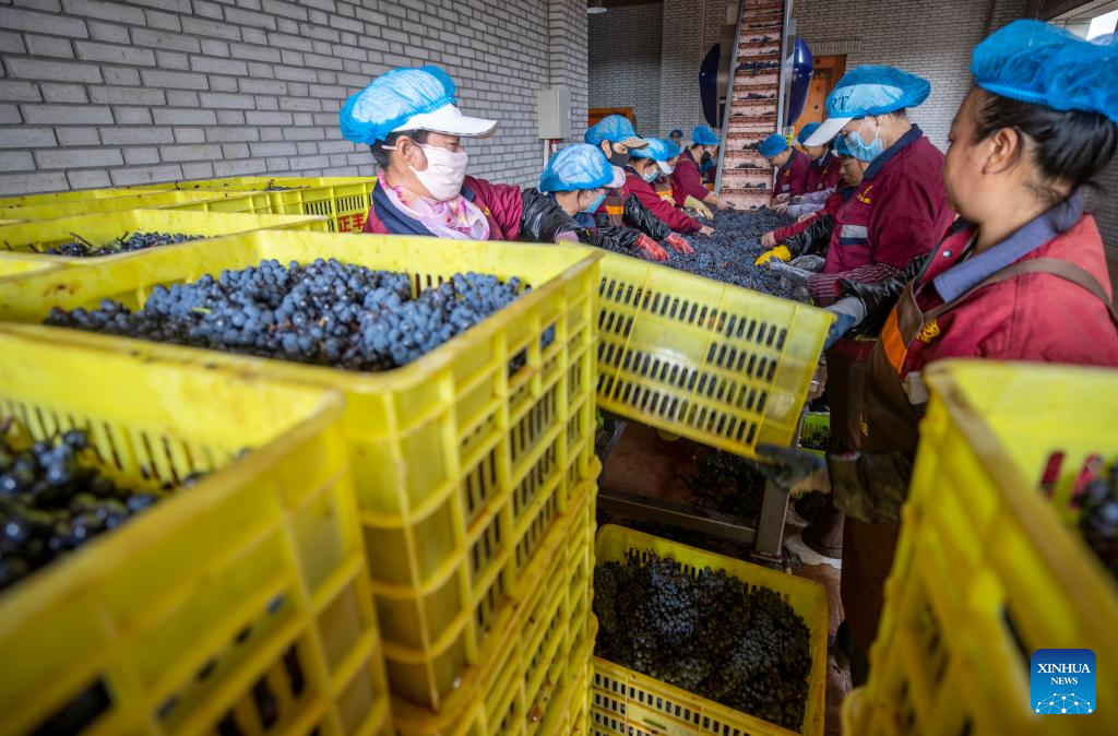 Workers sort harvested grapes in a winery at the eastern foot of Helan Mountain in northwest China's Ningxia Hui Autonomous Region, Sept. 19, 2024. With a dry climate and abundant sunshine, the eastern foot of Helan Mountain is widely regarded as a "golden zone" for wine grape cultivation and high-end wine production. The region has entered this year's harvest season of the wine grape recently. (Xinhua/Yang Zhisen)
