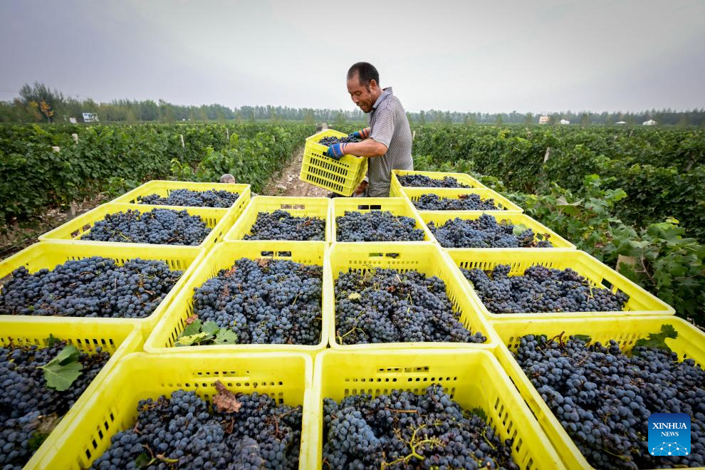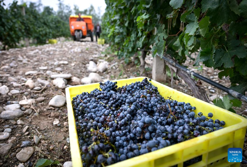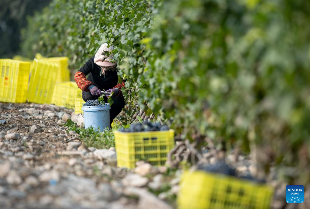 A farmer harvests grapes in a vineyard at the eastern foot of Helan Mountain in northwest China's Ningxia Hui Autonomous Region, Sept. 19, 2024. With a dry climate and abundant sunshine, the eastern foot of Helan Mountain is widely regarded as a "golden zone" for wine grape cultivation and high-end wine production. The region has entered this year's harvest season of the wine grape recently. (Xinhua/Yang Zhisen)