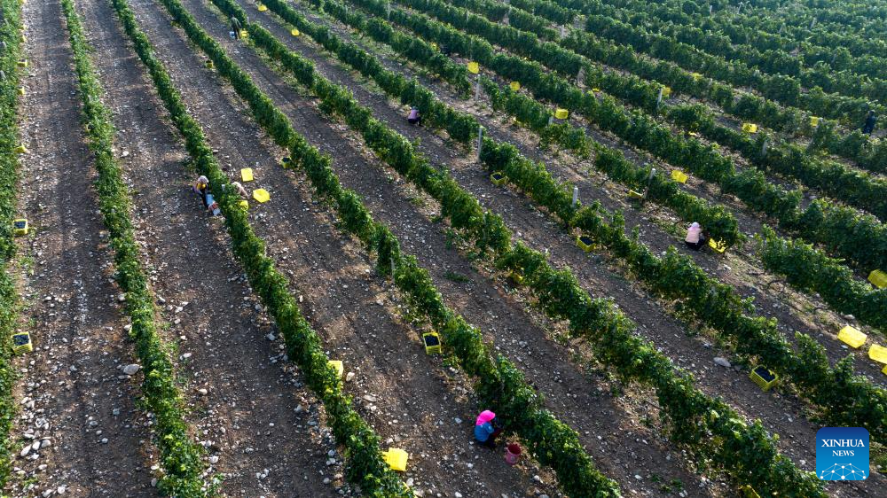 An aerial drone photo taken on Sept. 19, 2024 shows farmers harvesting grapes in a vineyard at the eastern foot of Helan Mountain in northwest China's Ningxia Hui Autonomous Region. With a dry climate and abundant sunshine, the eastern foot of Helan Mountain is widely regarded as a "golden zone" for wine grape cultivation and high-end wine production. The region has entered this year's harvest season of the wine grape recently. (Xinhua/Yang Zhisen)
