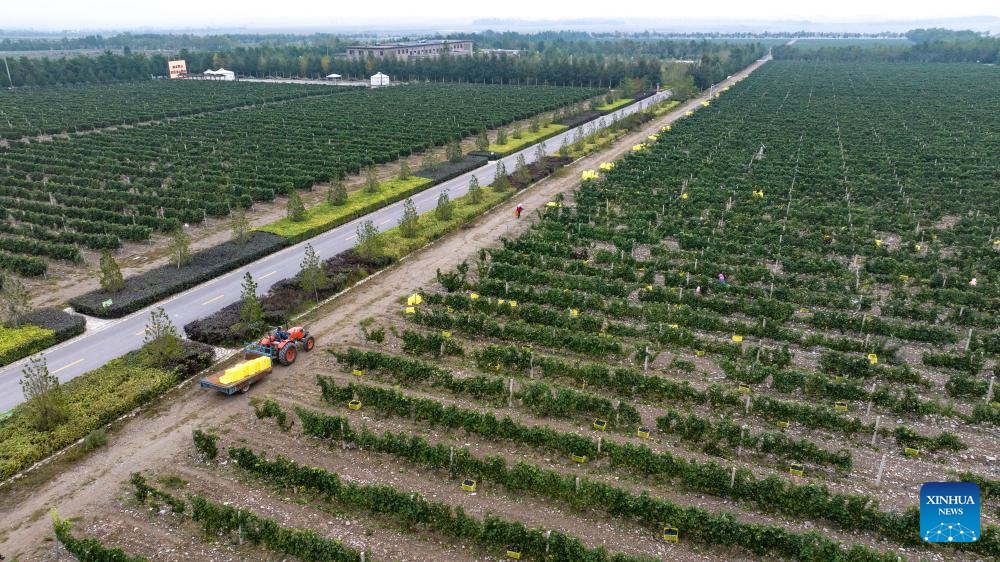 An aerial drone photo taken on Sept. 19, 2024 shows farmers transporting harvested grapes in a vineyard at the eastern foot of Helan Mountain in northwest China's Ningxia Hui Autonomous Region. With a dry climate and abundant sunshine, the eastern foot of Helan Mountain is widely regarded as a "golden zone" for wine grape cultivation and high-end wine production. The region has entered this year's harvest season of the wine grape recently. (Xinhua/Wang Peng)