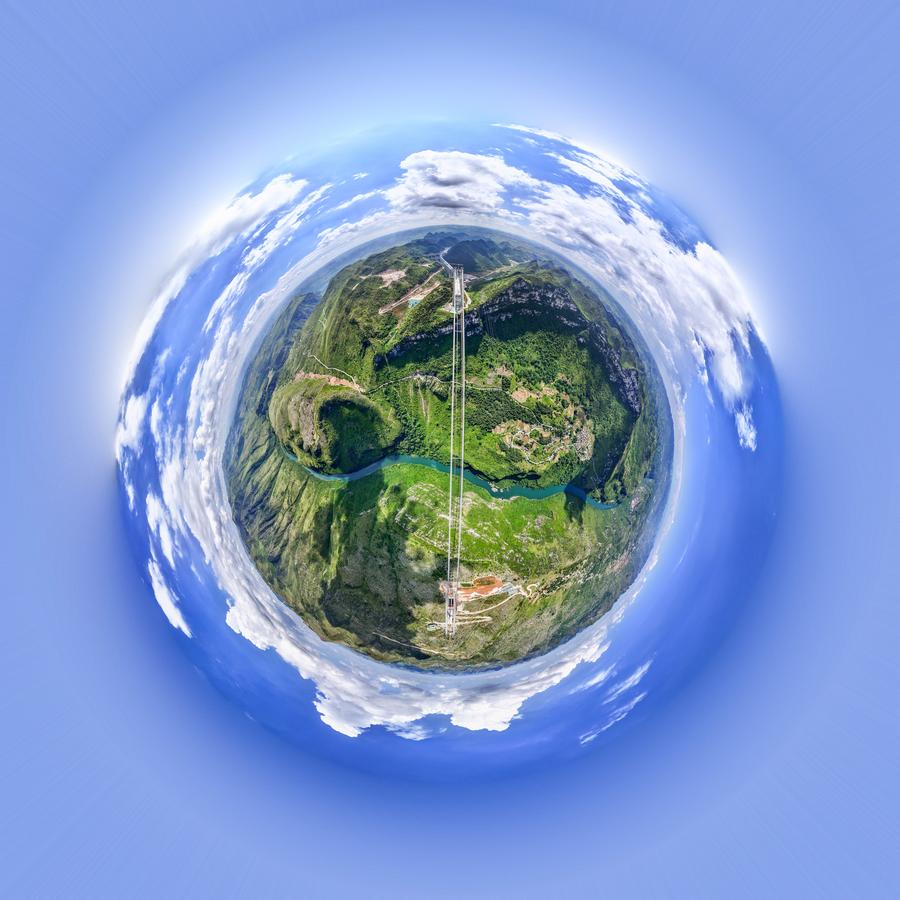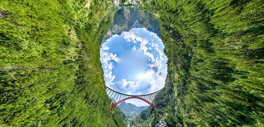 An aerial panoramic photo taken with a drone shows the Huajiang Grand Canyon Bridge in southwest China's Guizhou Province, Sept. 5, 2024. (Xinhua/Ou Dongqu)