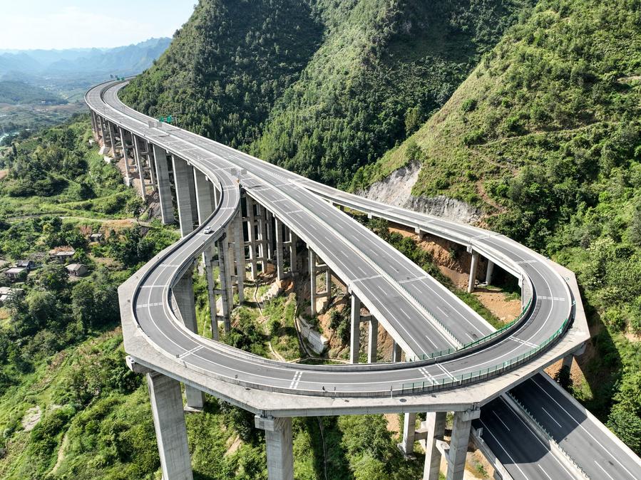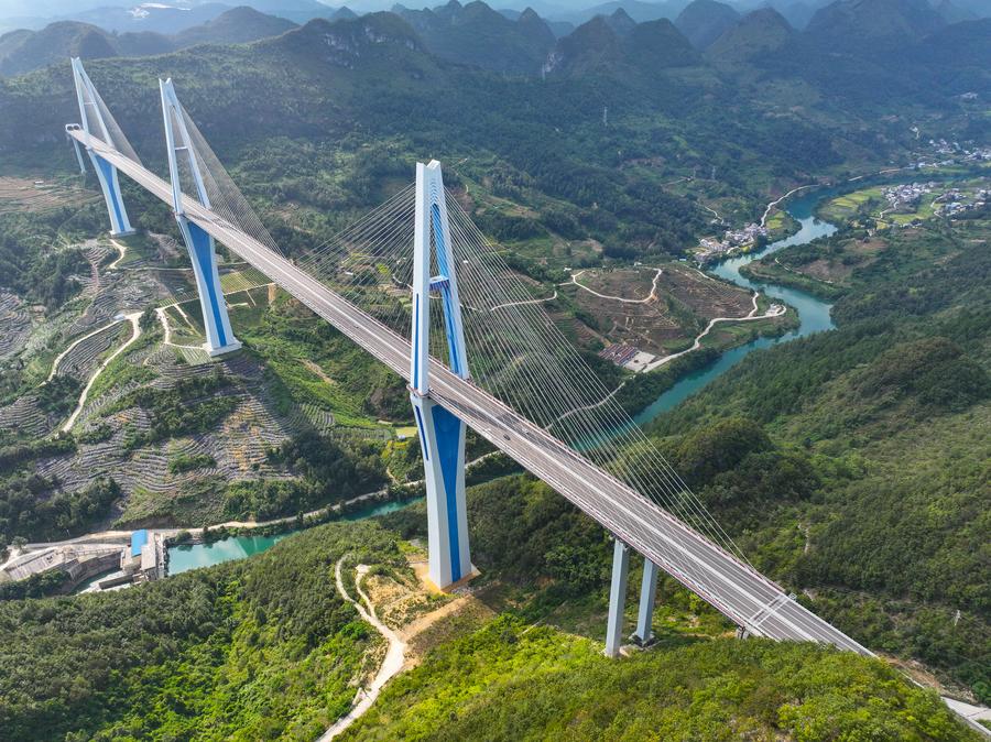 An aerial drone photo shows the Pingtang bridge on the expressway linking Pingtang and Luodian in southwest China's Guizhou Province, Sept. 5, 2024. (Xinhua/Liu Xu)