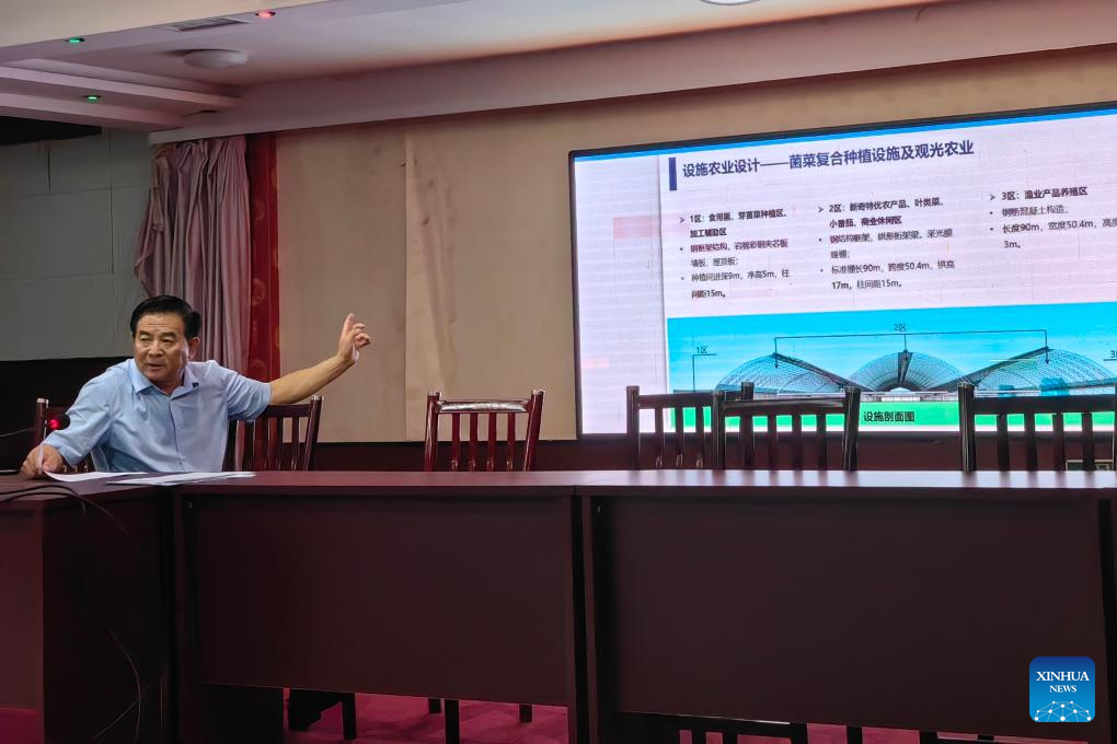 Yin Jiping, Party secretary of Tayuanzhuang Village, explains the working plans of local government to villagers at the meeting hall of Tayuanzhuang Village, Zhengding County, north China's Hebei Province, July 21, 2024. (Xinhua/Zhou Rui)